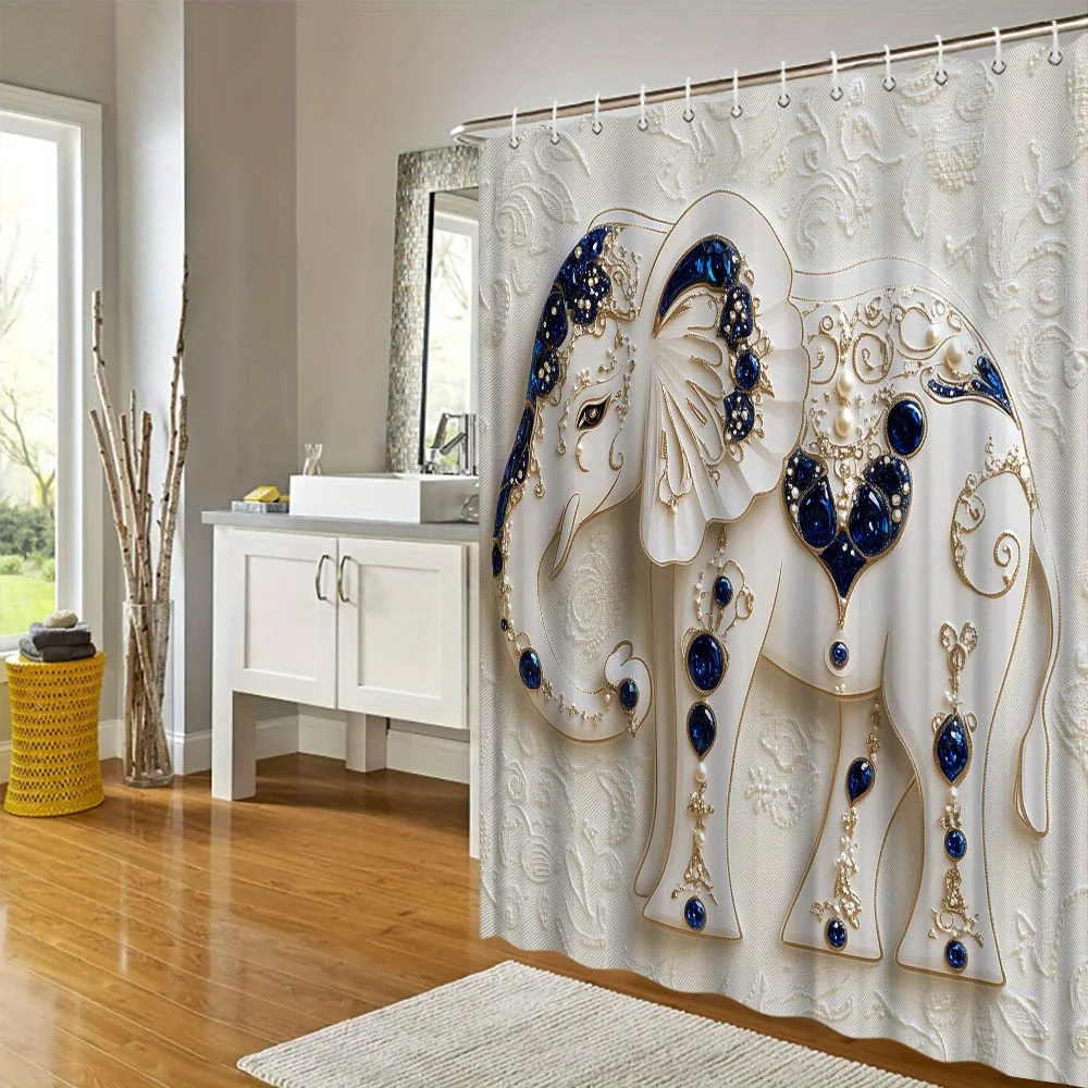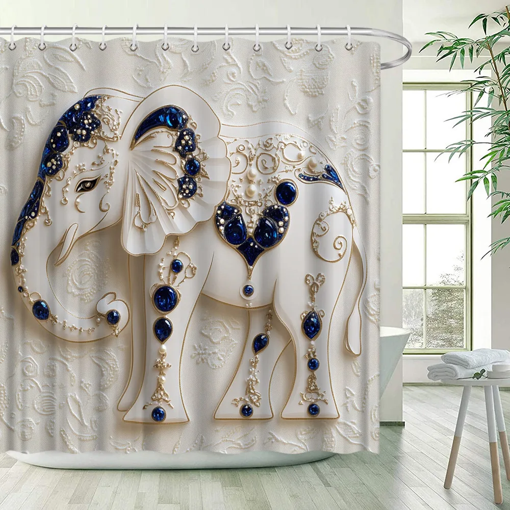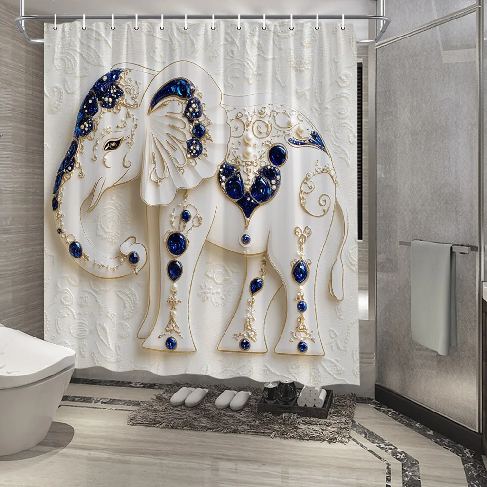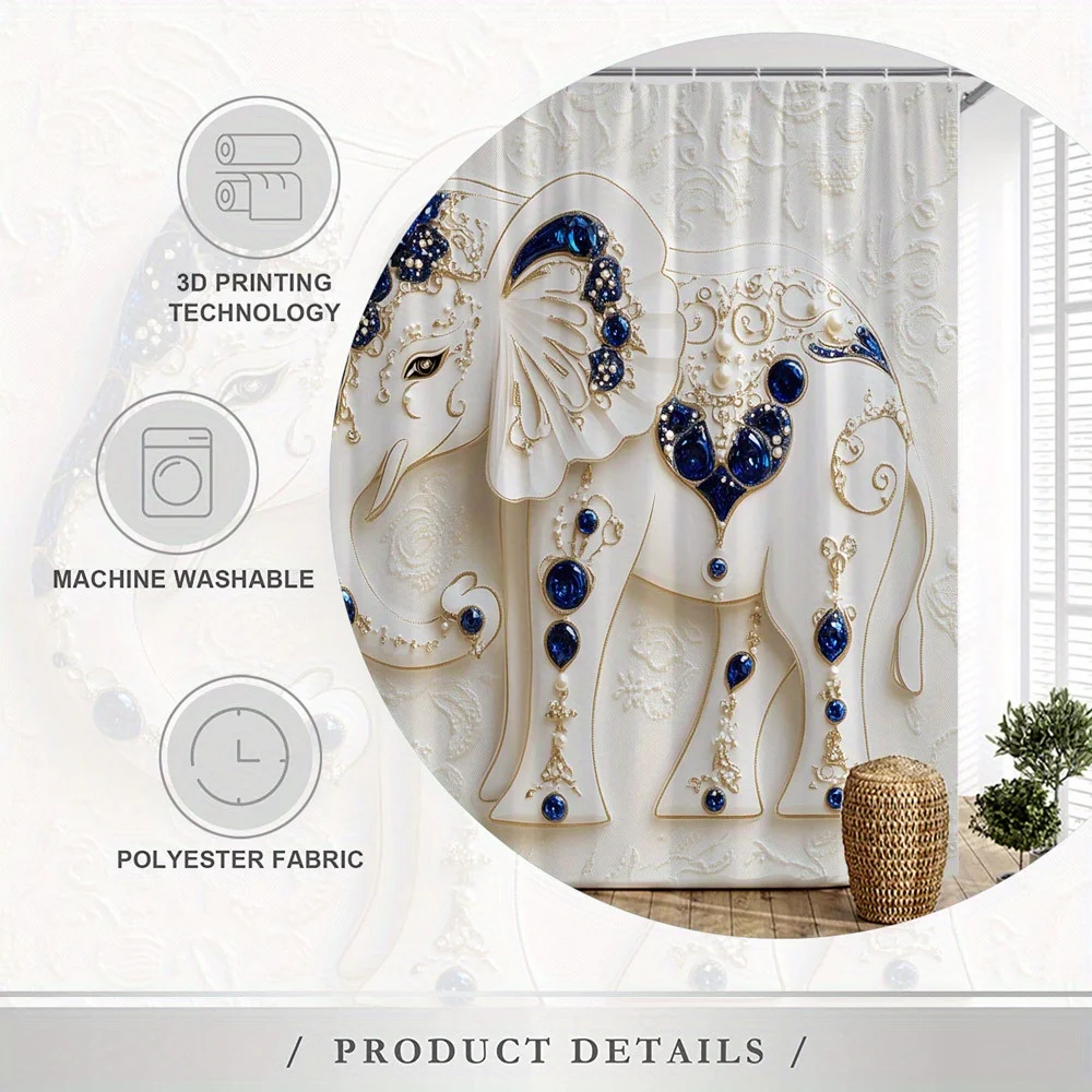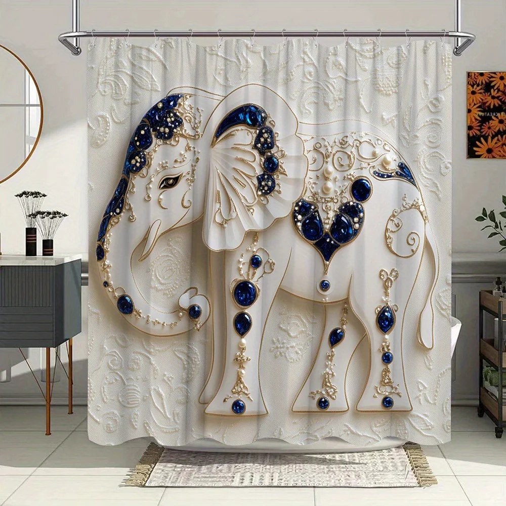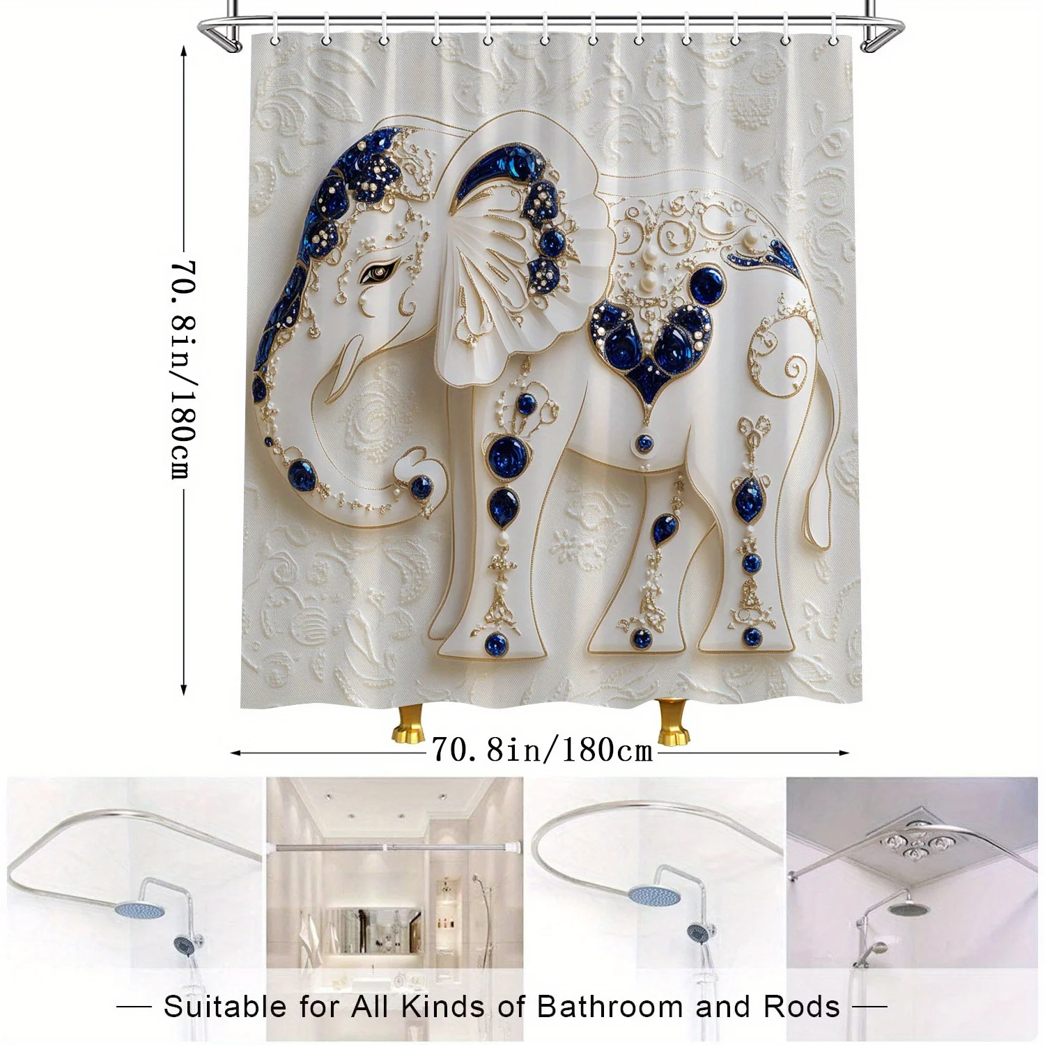 Ornate Elephant Shower Curtain, Golden & Blue Patterns on White Polyester,12 Hooks, Baroque Victorian Bath Decor